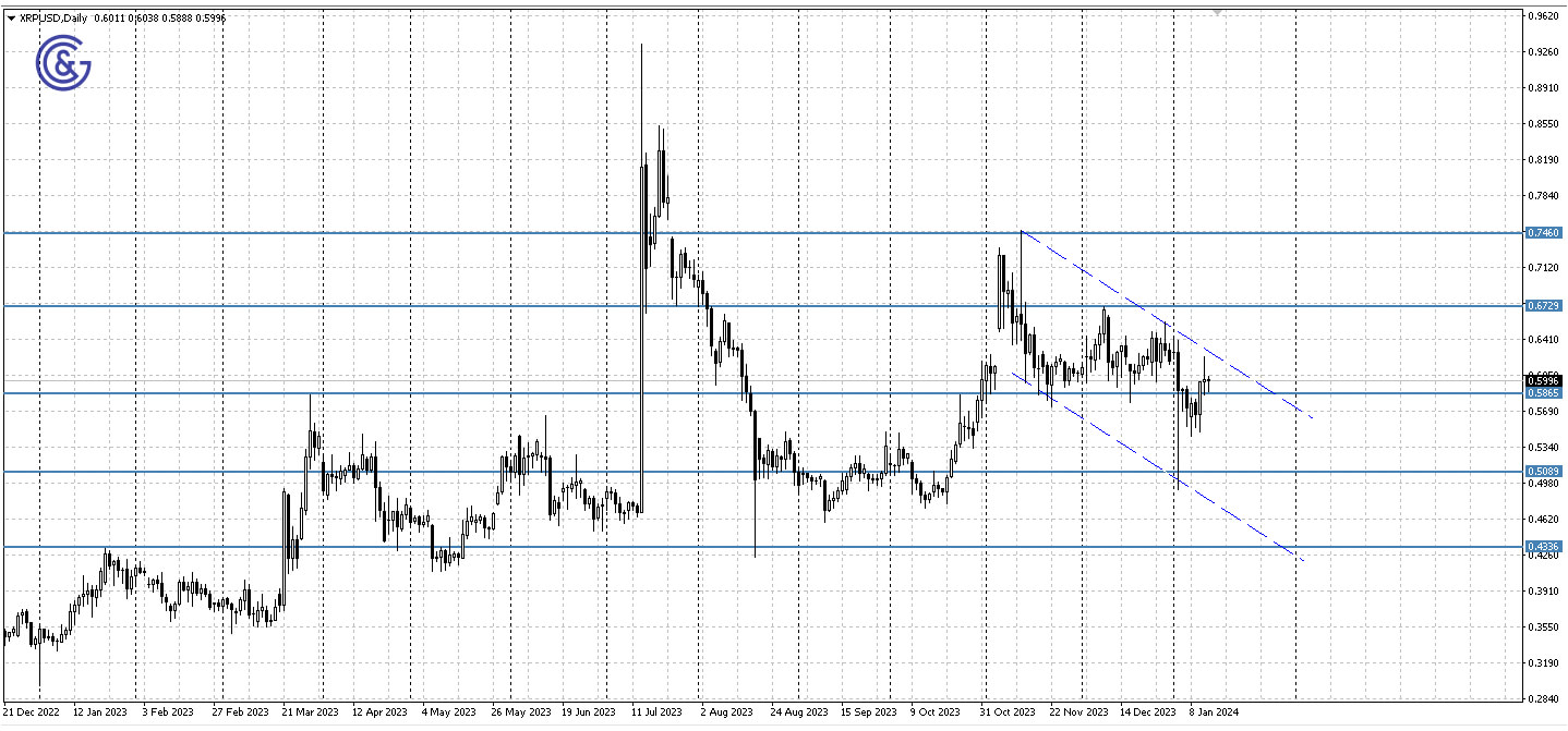 Ripple has been trading in a downward trend since October, with XRP/USD quotes currently consolidating around 0.5865. If this support fails to hold, it might lead to a southward movement towards the 0.5089 horizontal level. An alternative scenario could result in an uptrend towards the level of 0.6729.