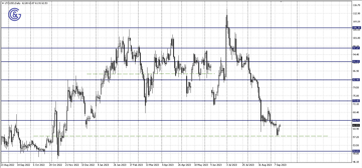 Litecoin, as a result of the fall this week, found support at 55.68 marked with dotted lines, but then recovered its losses and is approaching the resistance at 64.70, having a small room to move to it.