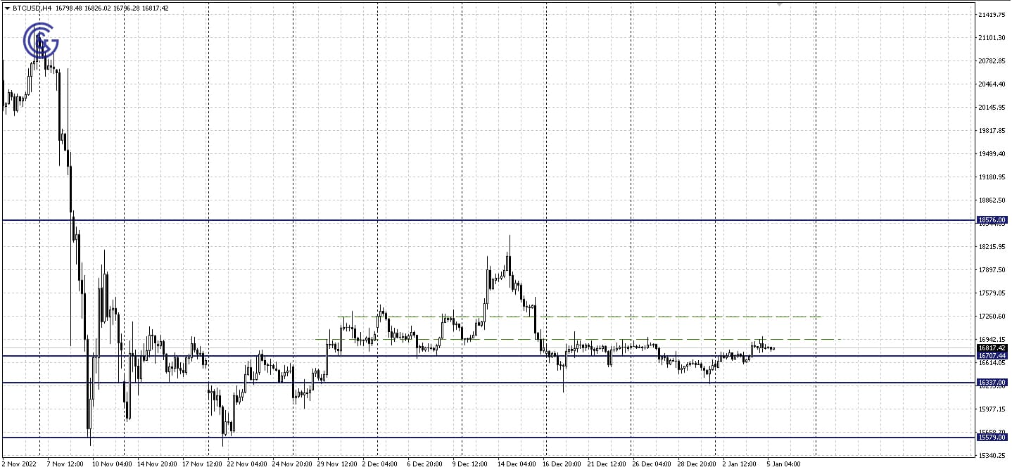 Bitcoin is trading in a narrow sideways range between the 16,701 support and the 16,941 local dotted resistance. If the price manages to exit the flat, the 17.241 level will serve as the next growth target. In contrast, if the cryptocurrency drops below the current support, this will unlock the way to the 16.337 level.