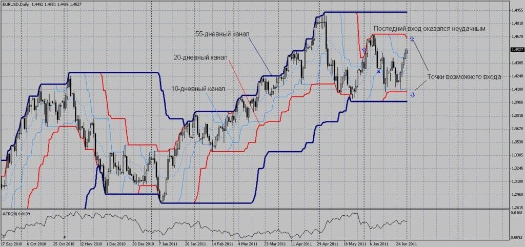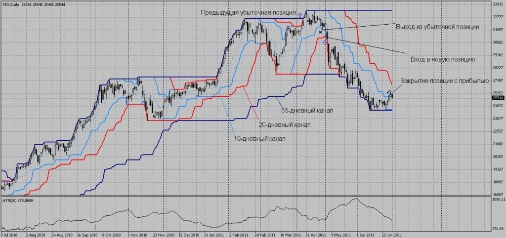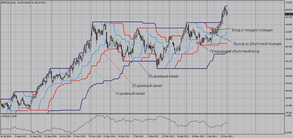 Также можно входить и после прибыльной сделки, но уже не на 20-дневном, а на 55-дневном максимуме или минимуме.