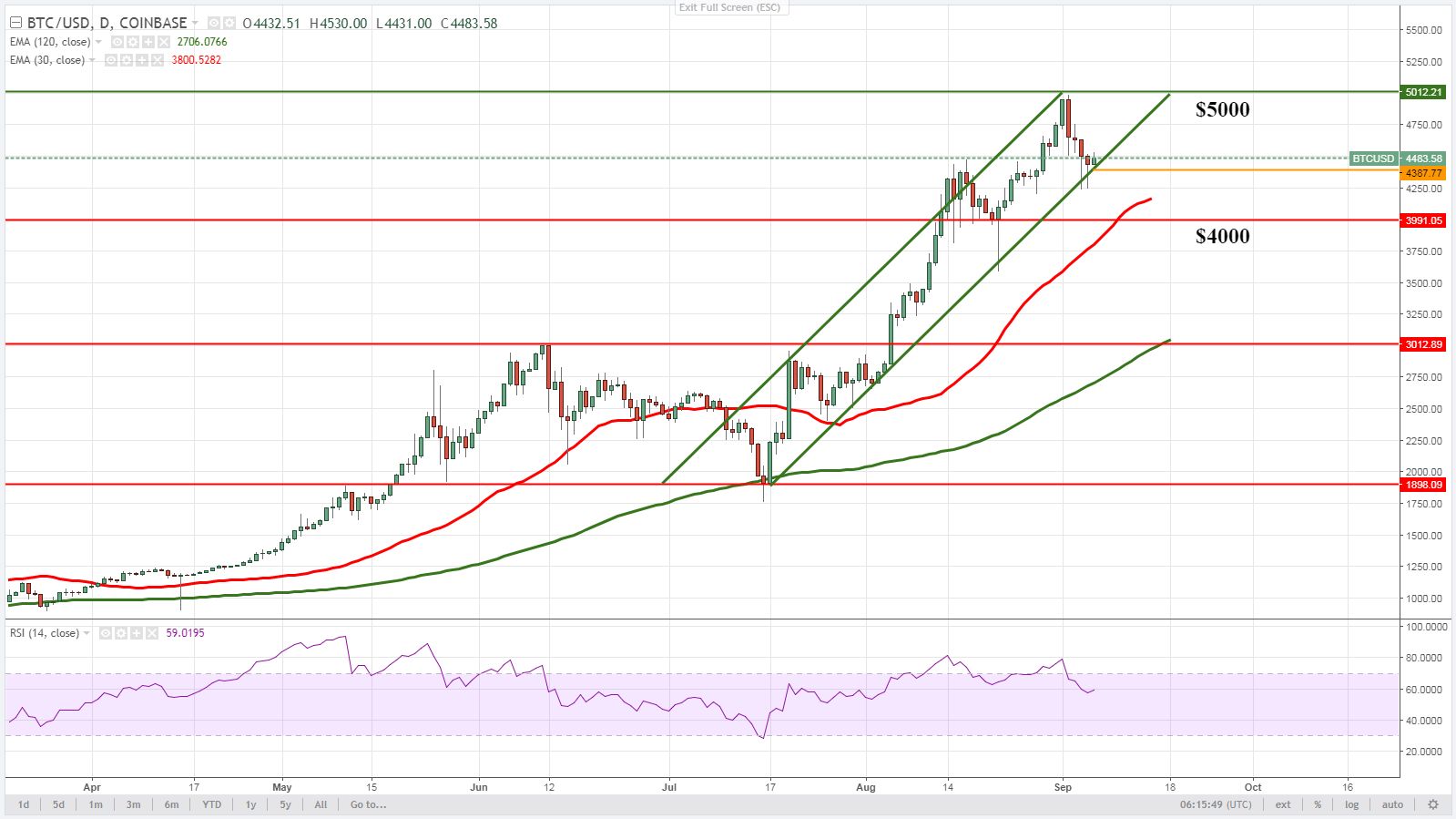 В данный момент котировки нашли поддержку на промежуточном уровне поддержки $4400, откуда торговцы пробуют создать новый восходящий импульс, для взятия отметки $5000.