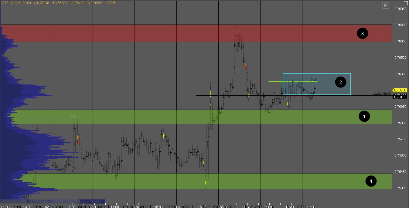 Покупатель пытается продавить зону сопротивления 2, для того что бы продолжить движение вверх к зону сопротивления 3. Если зона поддержки 1 будет пробита, продажи должны будут возобновиться к цели 4, откуда снова можно рассматривать покупки.