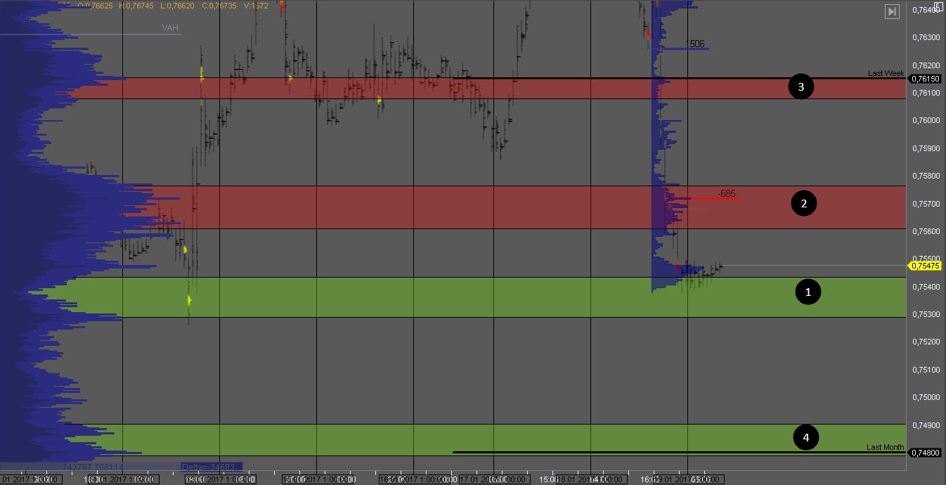 Йена также торговалась под контролем продавцов на американской сессии и достигла цели в зоне 1. На данный момент лучшая цена для поиска продаж в зоне 2. Пробой зоны 1 даст возможность продавцам продолжить снижение к цели в зоне 4.