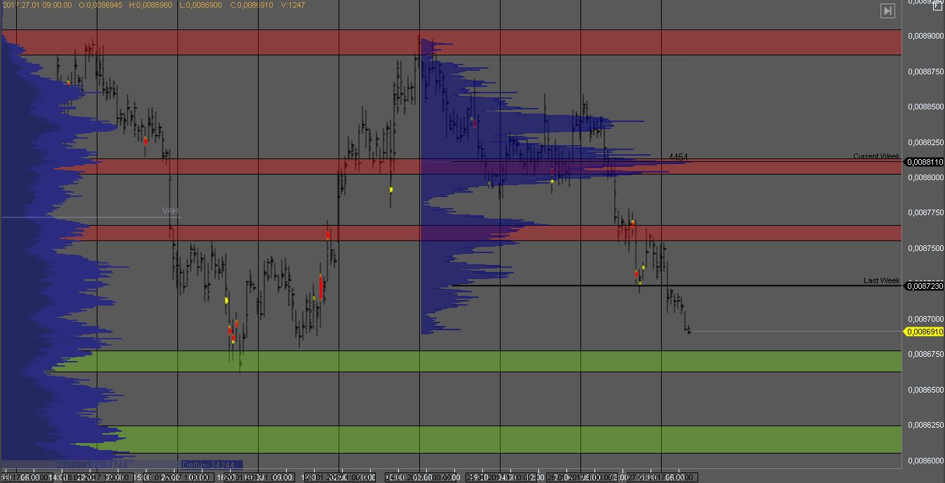 Продавец пытается продавить покупателя и в случае выхода из объема в зоне 1 вниз, продажи должны будут продолжиться к цели в зоне 2. Искать возможности для продажи можно на повторном тесте зоны 1 и объема продавца. Припробоя зоны 1 мы получим признаки слабости продавца.