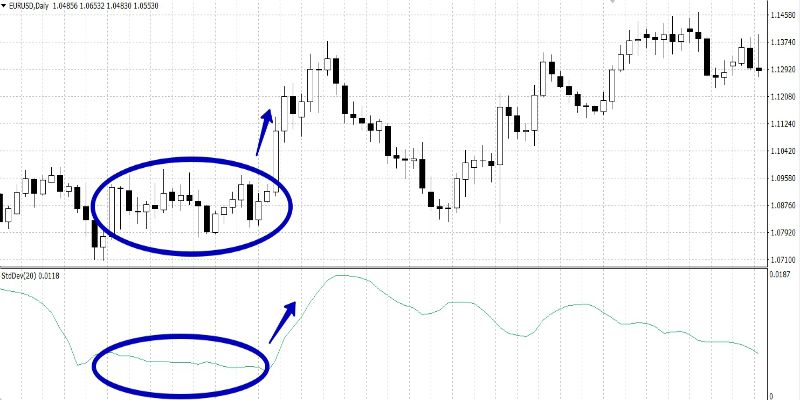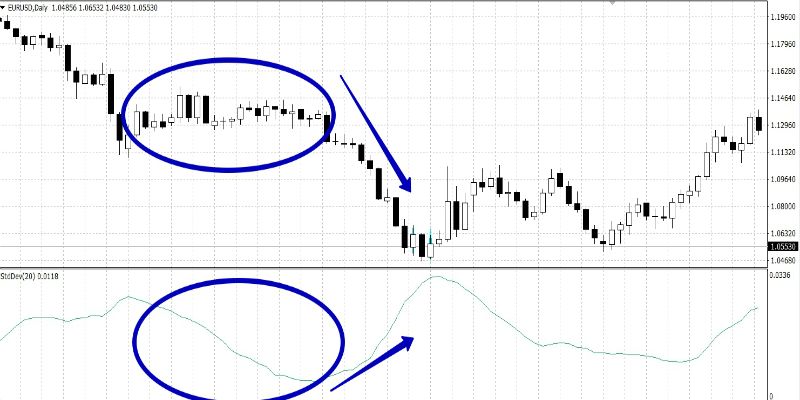 Индикатор стандартного отклонения Standard Deviation (SD) призван показывать волатильность рынка. Повышение показателей индикатора говорит о повышении волатильности на рынке, понижение сигнальной линии – об уменьшении волатильности.
